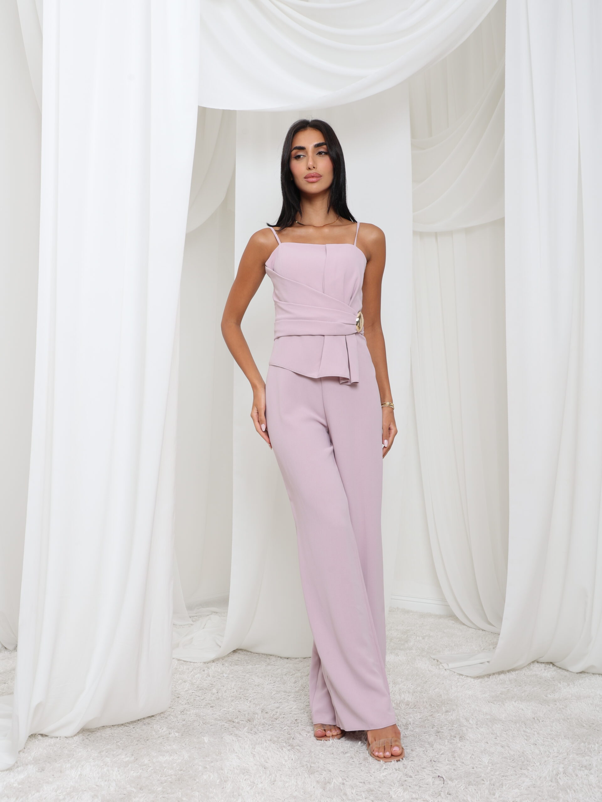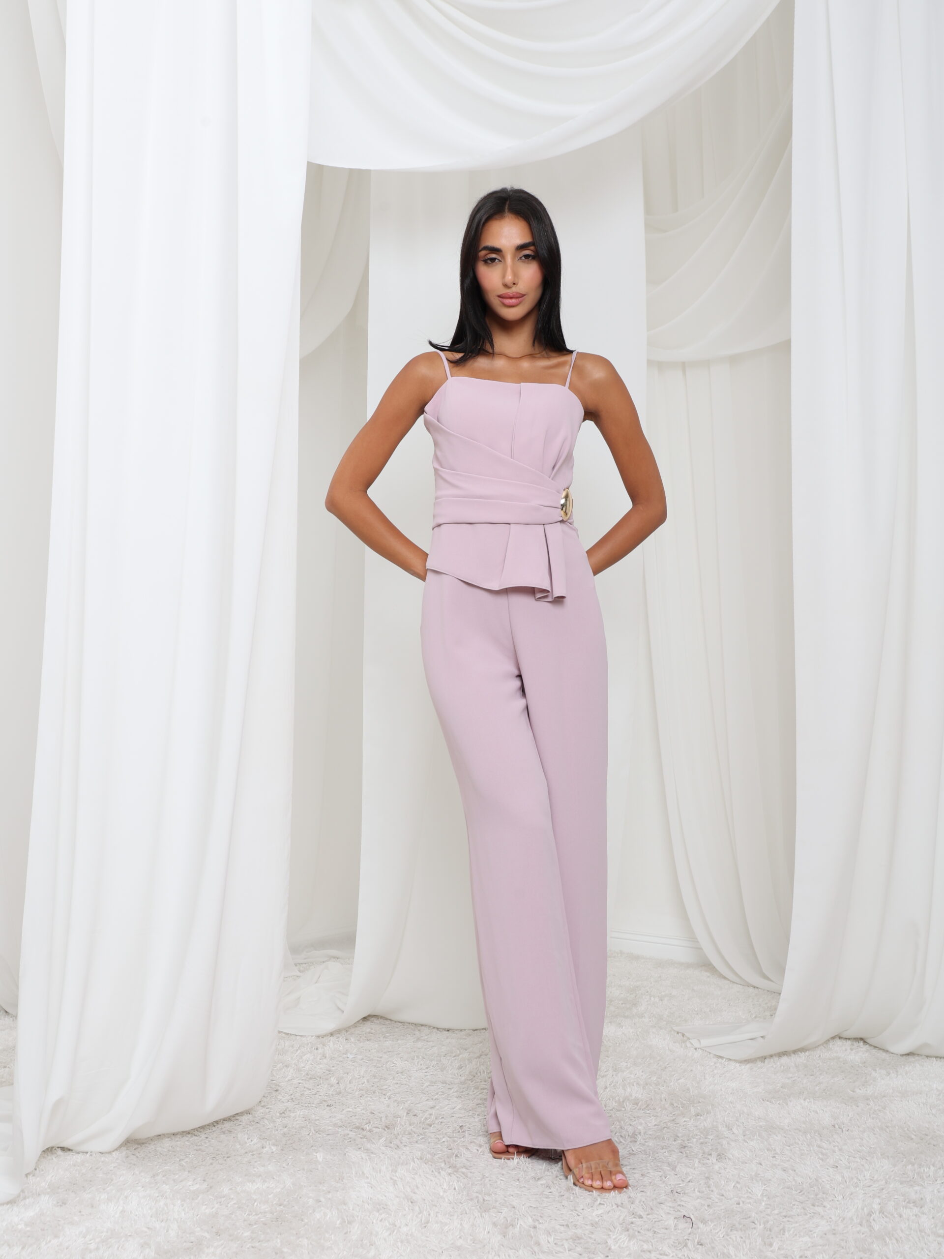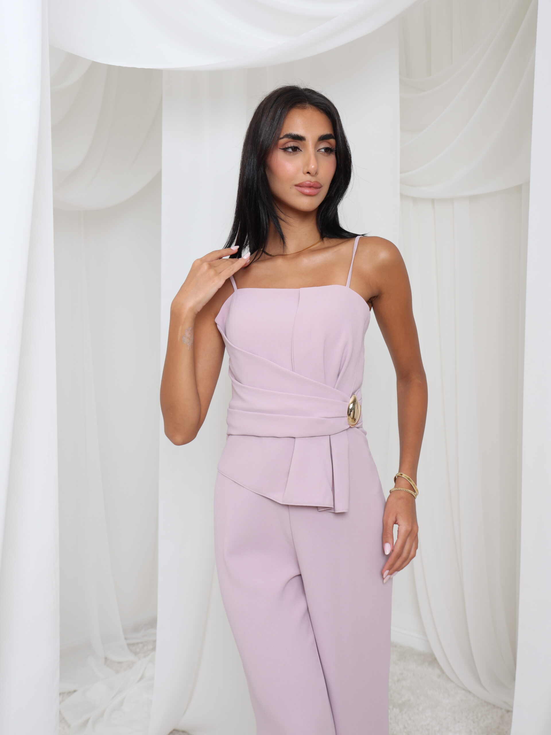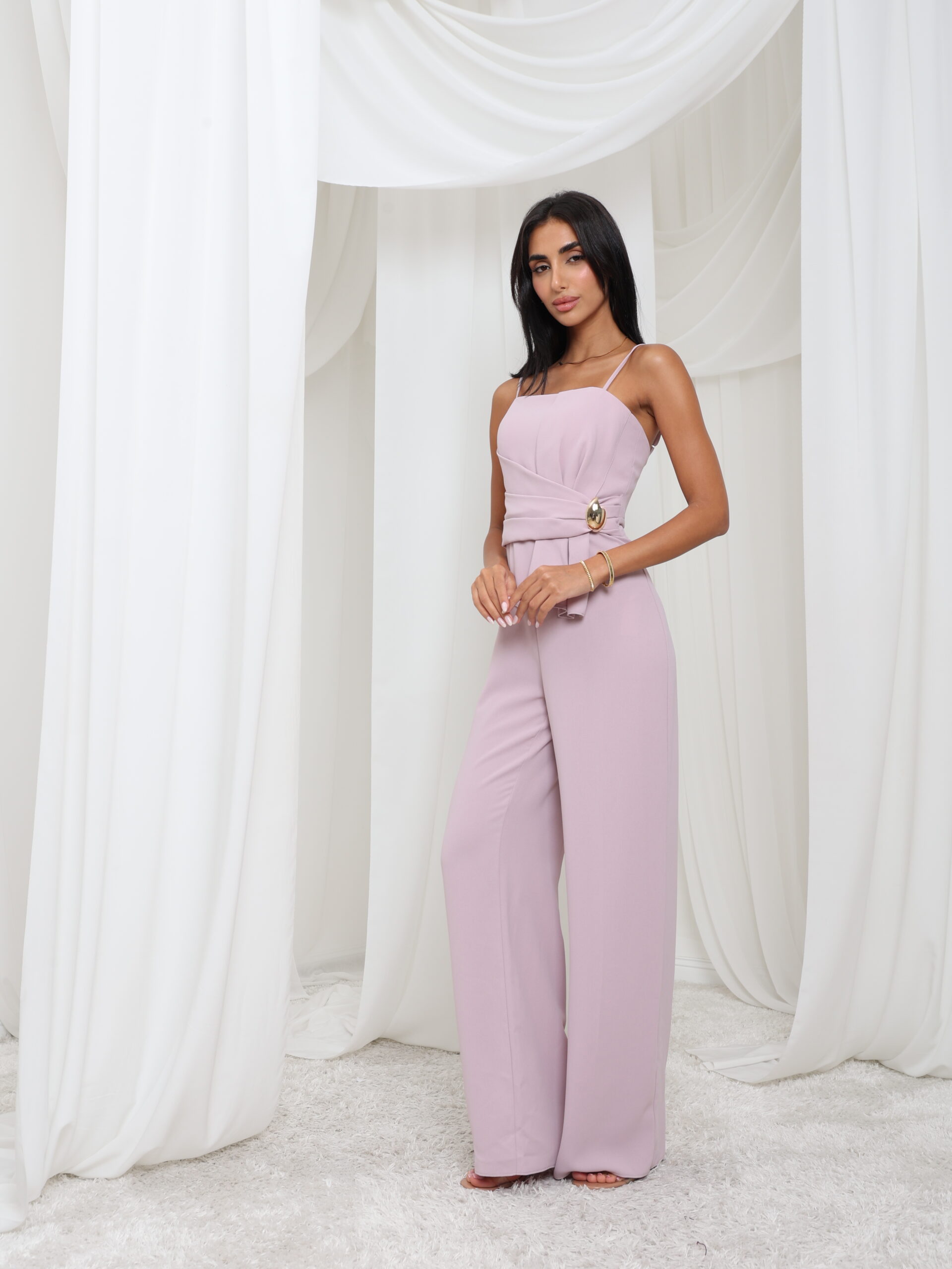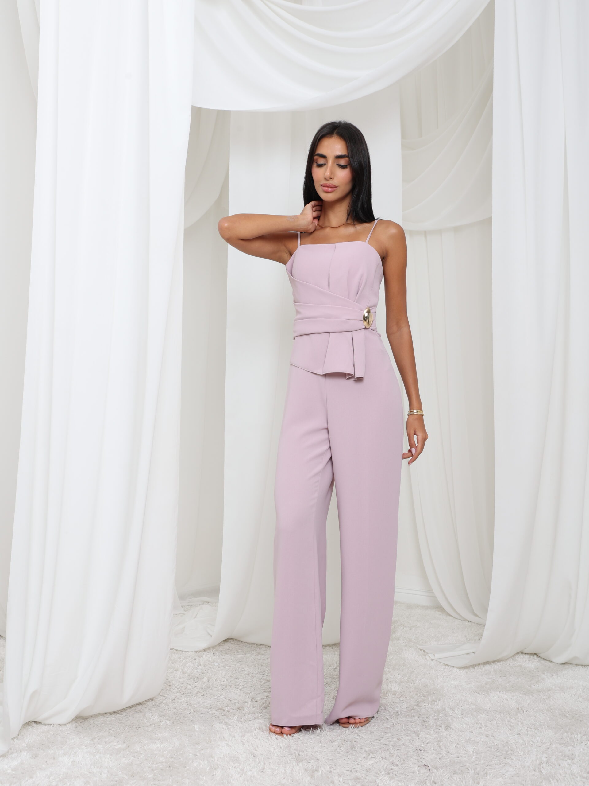 jumpsuit ناعم باللون البنفسجي مع حمالات رفيعة رفيعة، وصدرية منظمة، وتفاصيل خصر ملفوفة مزينة بإبزيم ذهبي اللون - أنيق بكل سهولة ومثالي للأناقة العصرية.