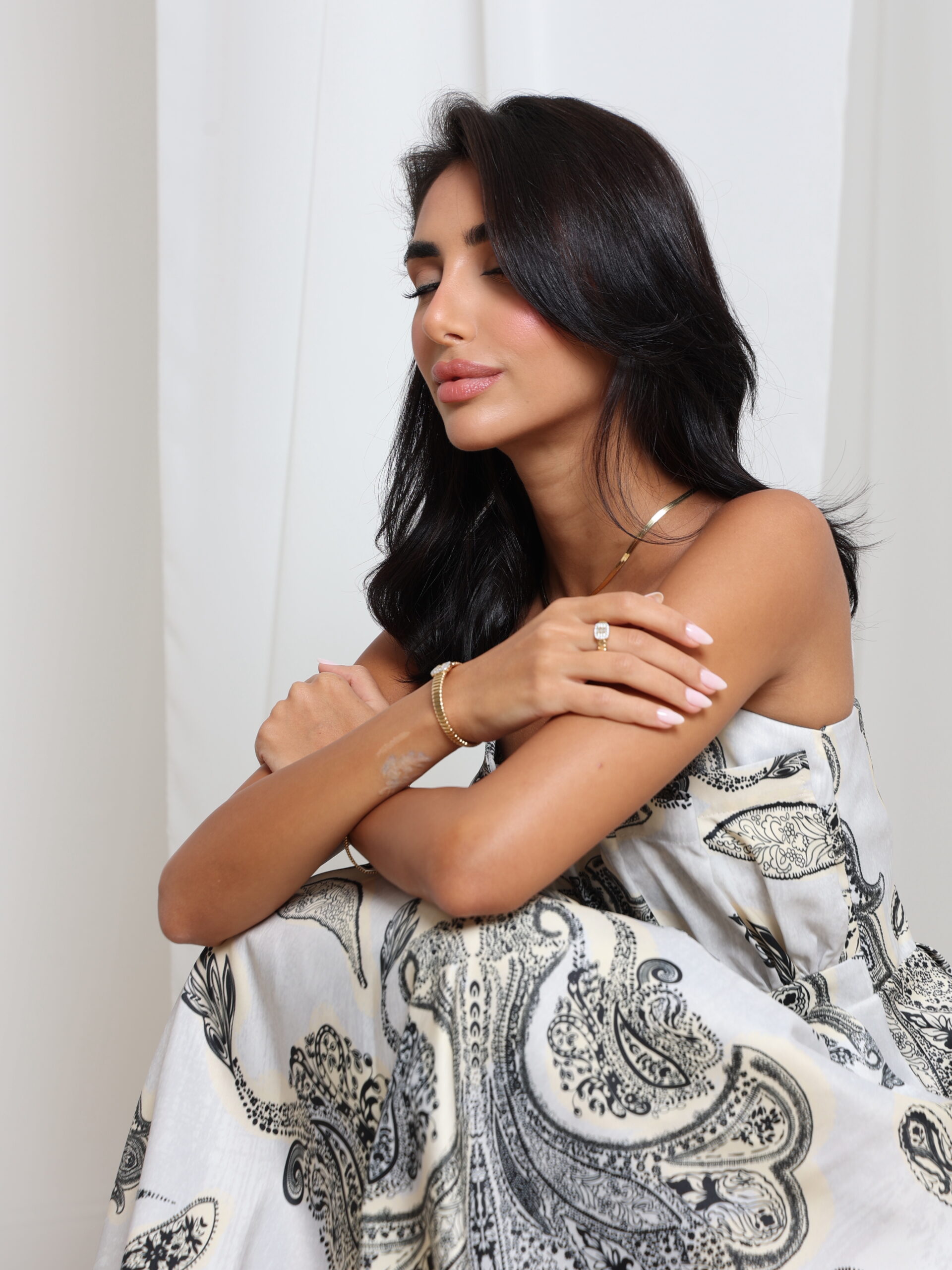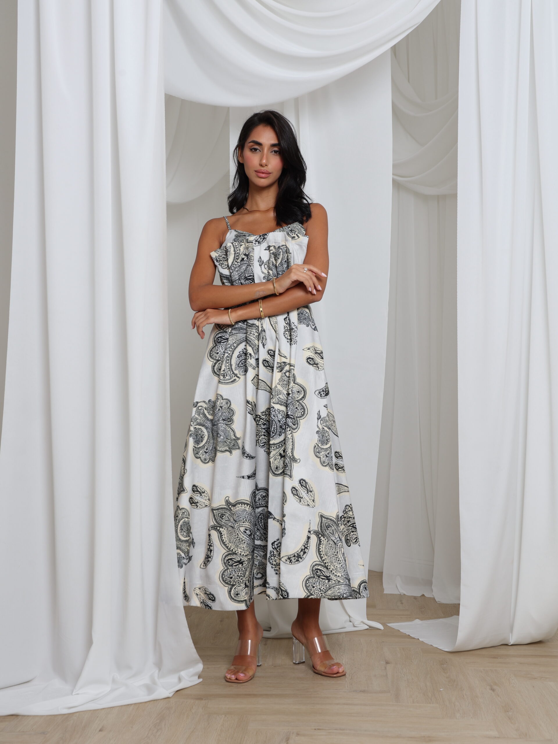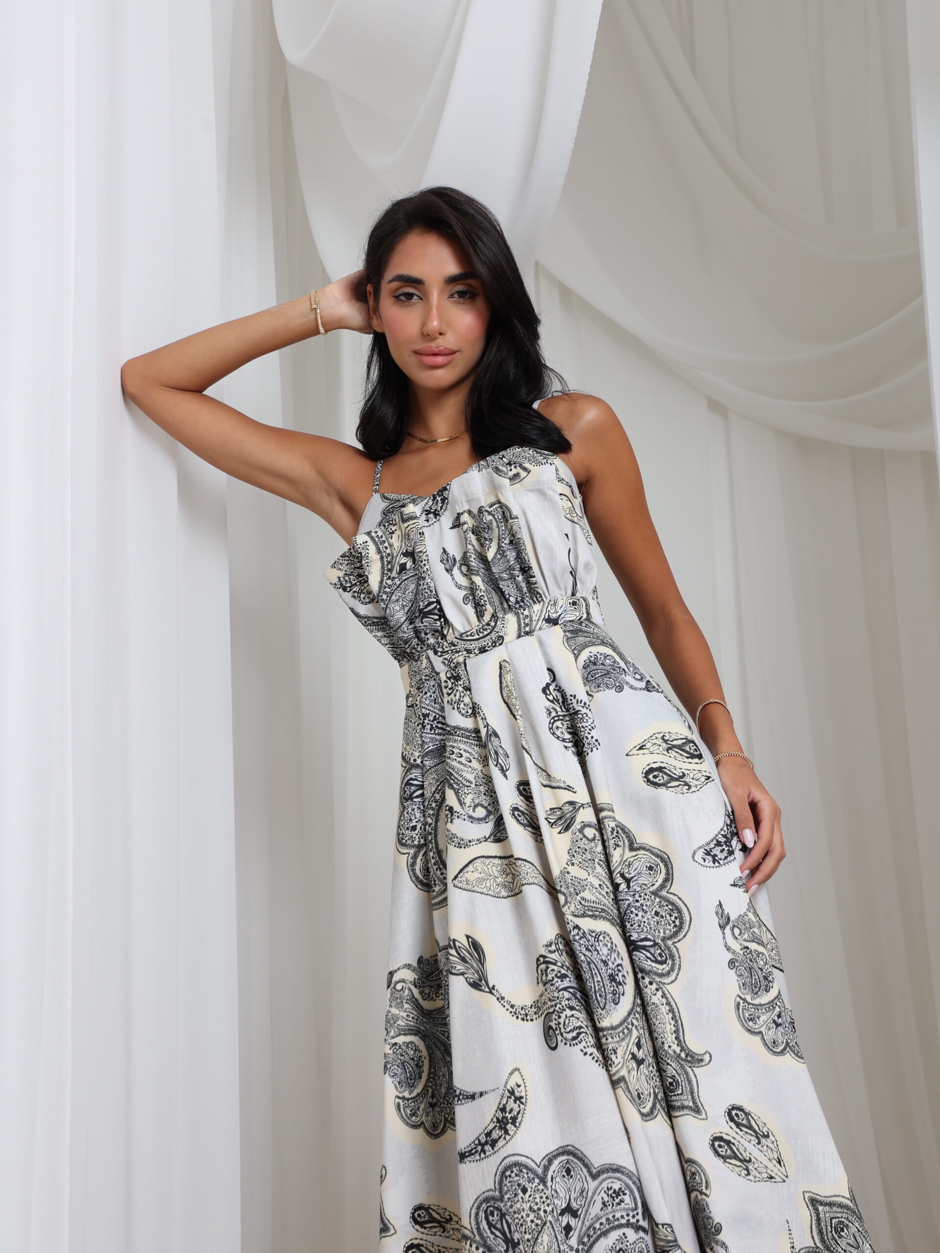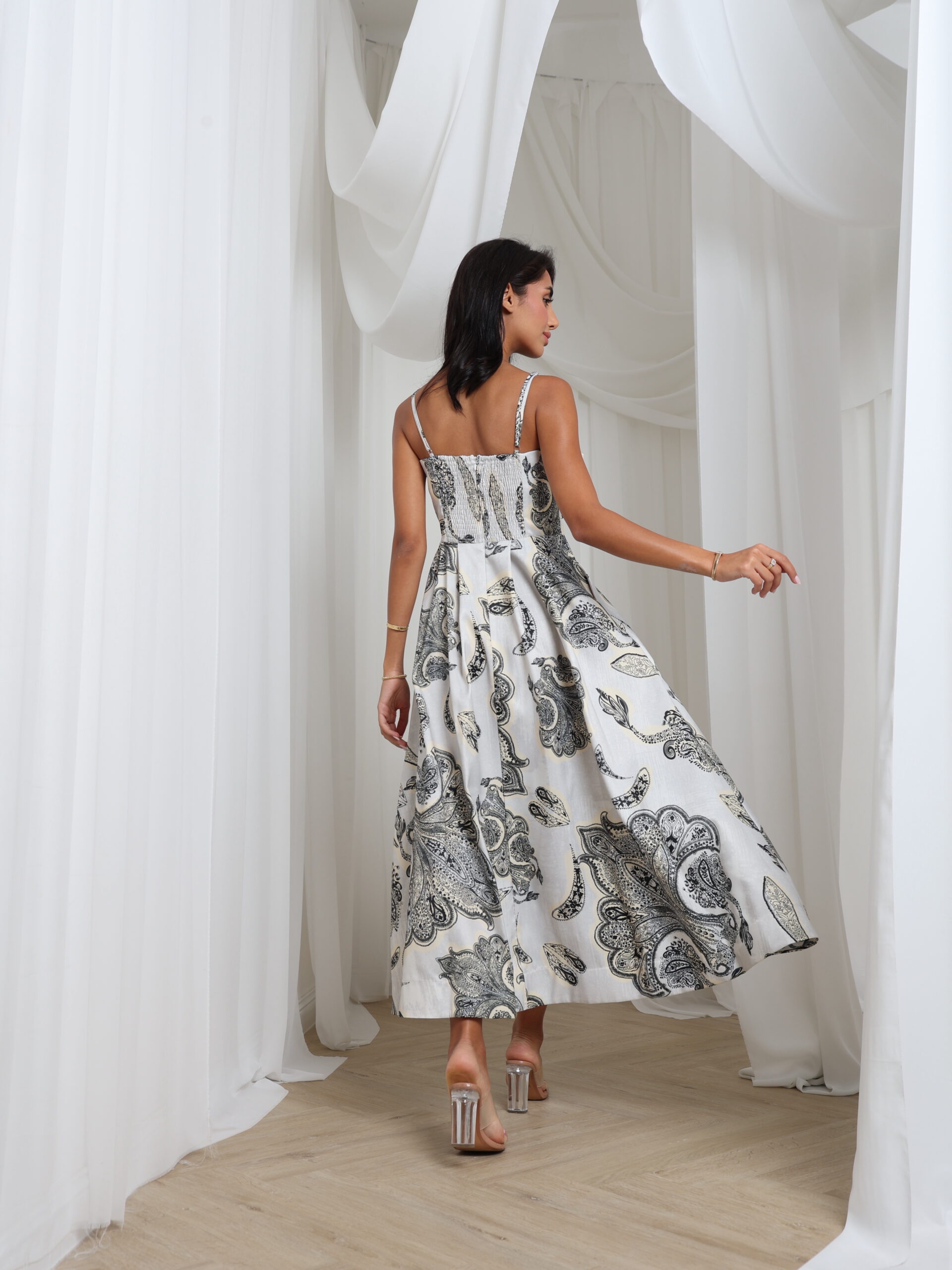 فستان منسدل بطول الكاحل مع حمالات رفيعة وصدرية منظمة، مزين بطبعة بيزلي أنيقة - مثالي لسحر النهار السهل مع لمسة من الرقي البوهيمي.