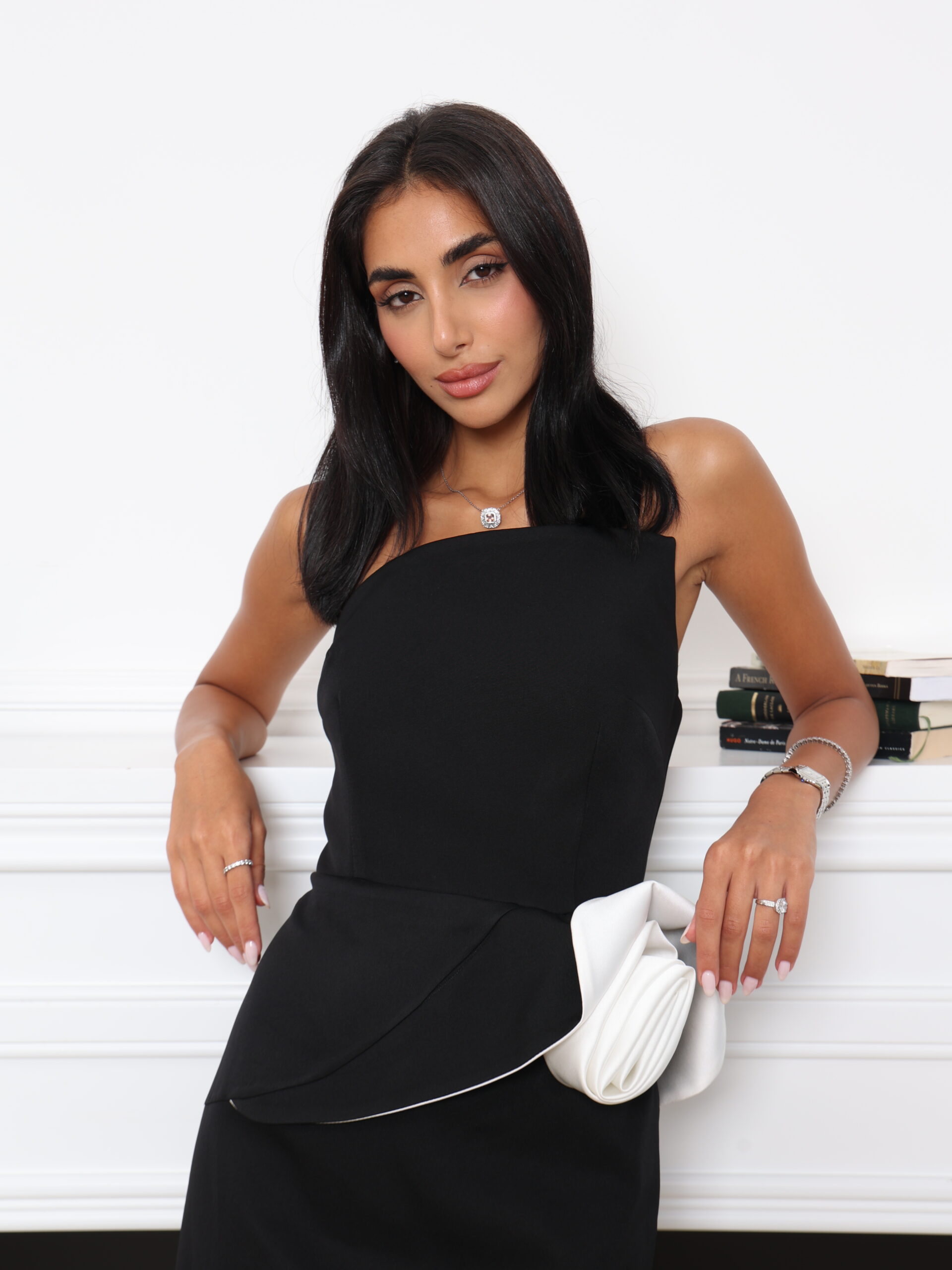 فستان قصير أنيق باللون الأسود بدون حمالات مع تصميم منحوت، يتميز بتفاصيل غير متماثلة عند الخصر مزينة بلمسة وردية بيضاء جريئة - مزيج رائع من الأناقة والفن الحديث.