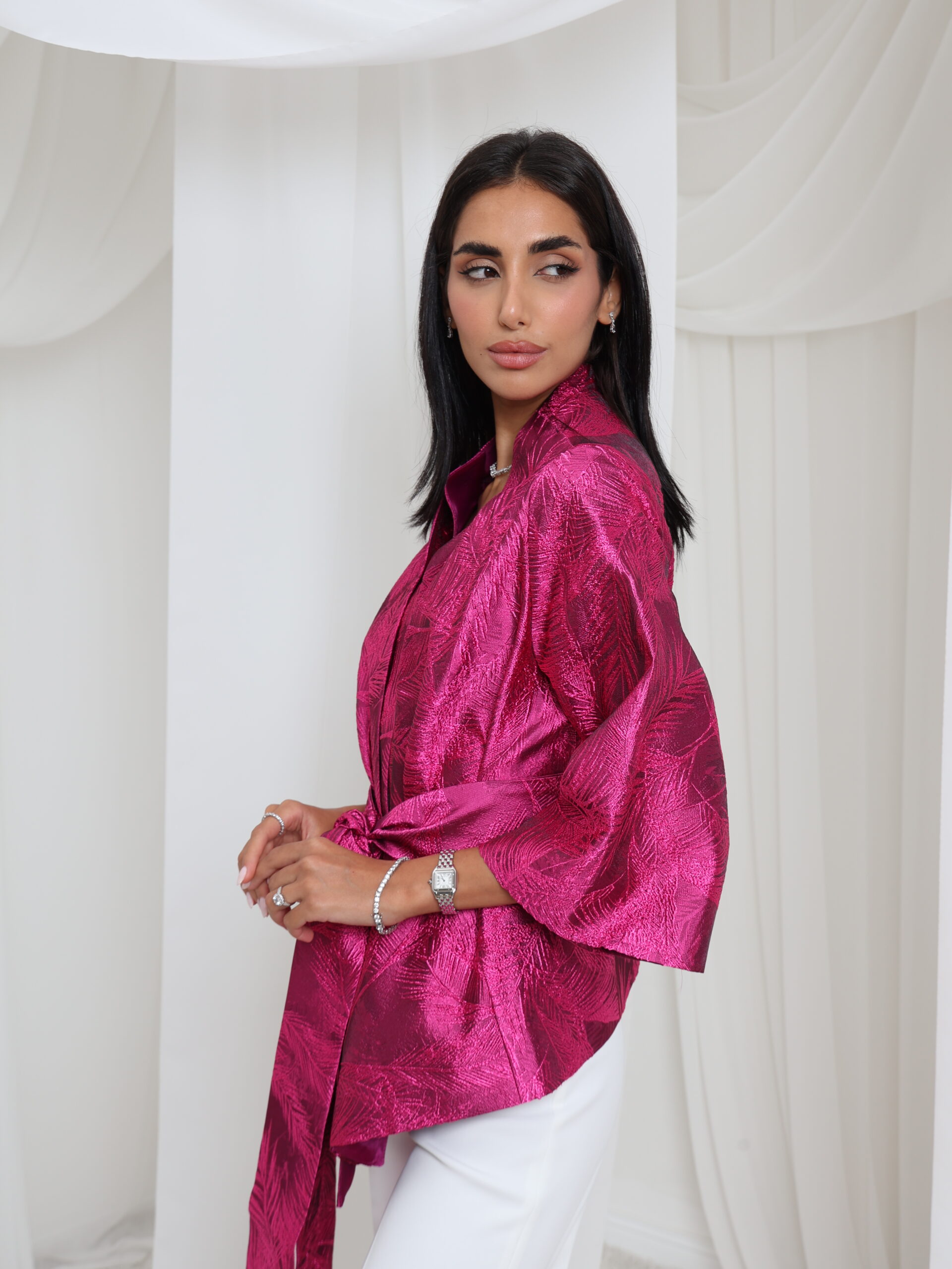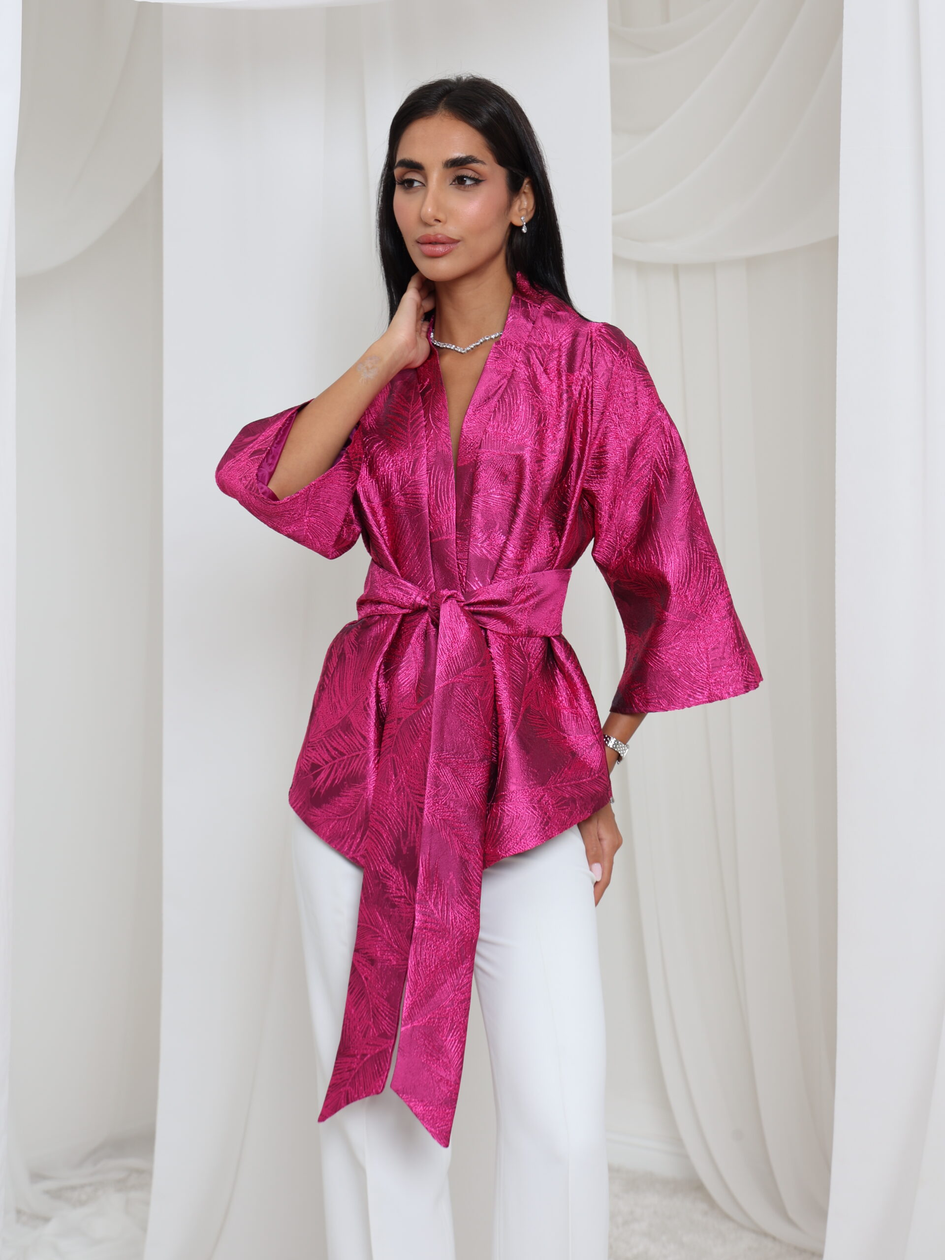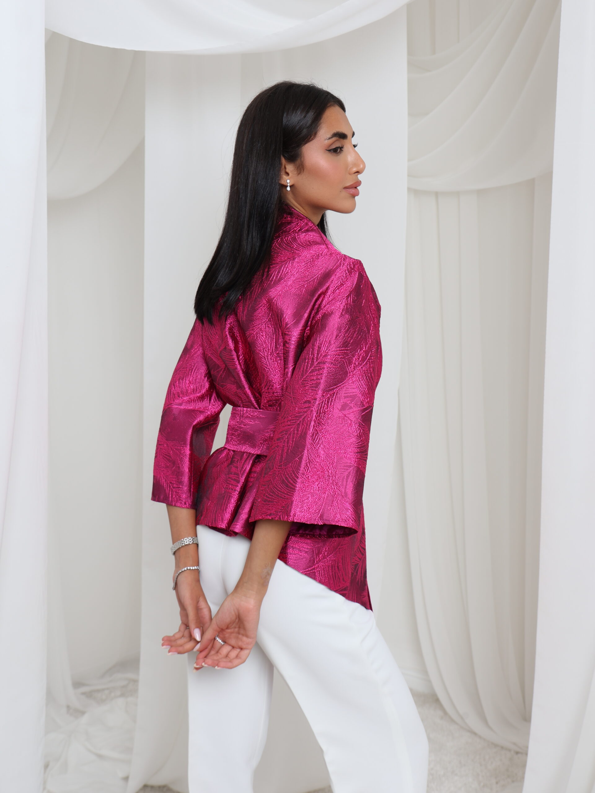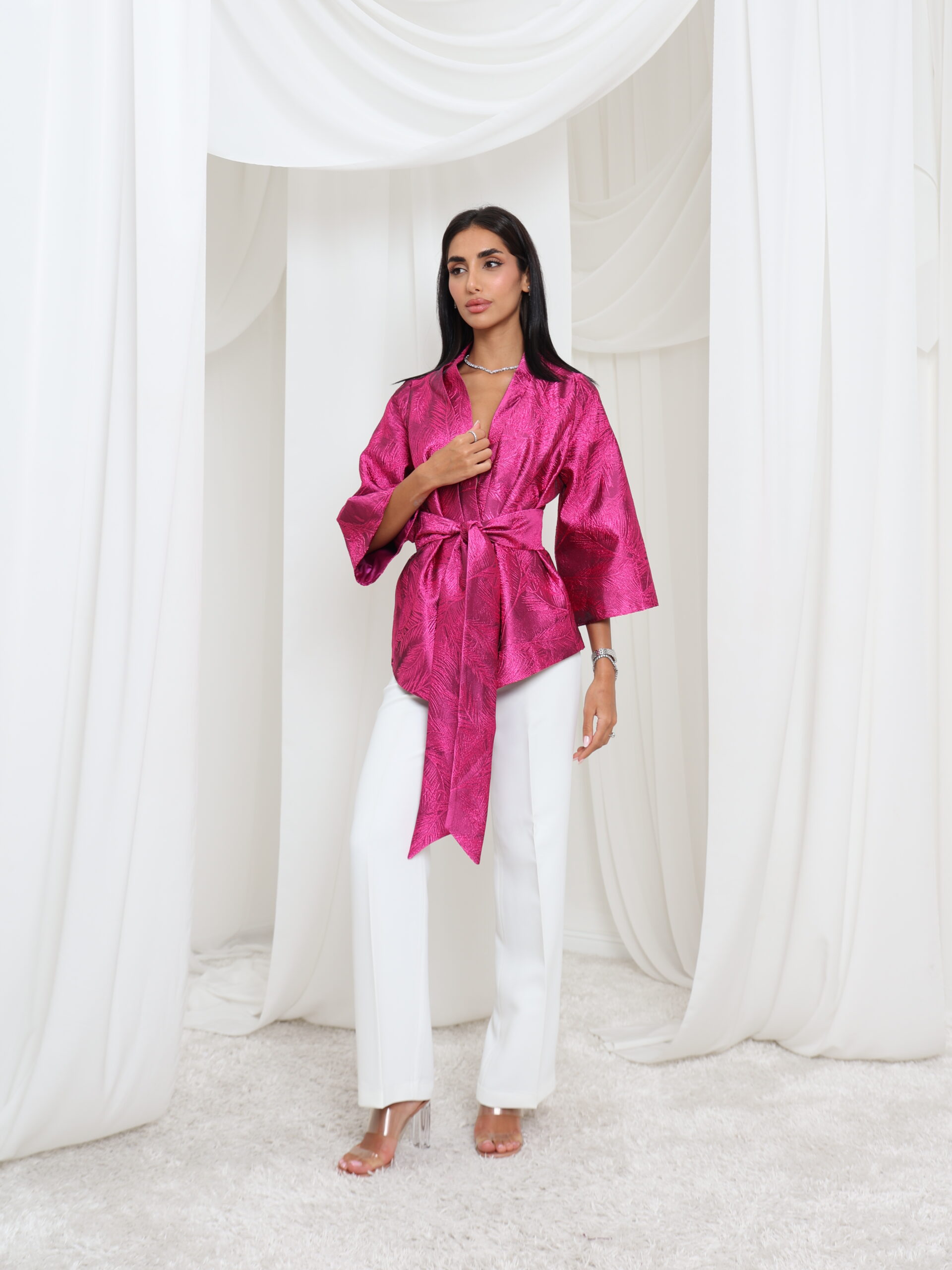 A chic and elegant ensemble featuring a vibrant magenta kimono-style wrap top with a textured jacquard finish and a statement waist tie.