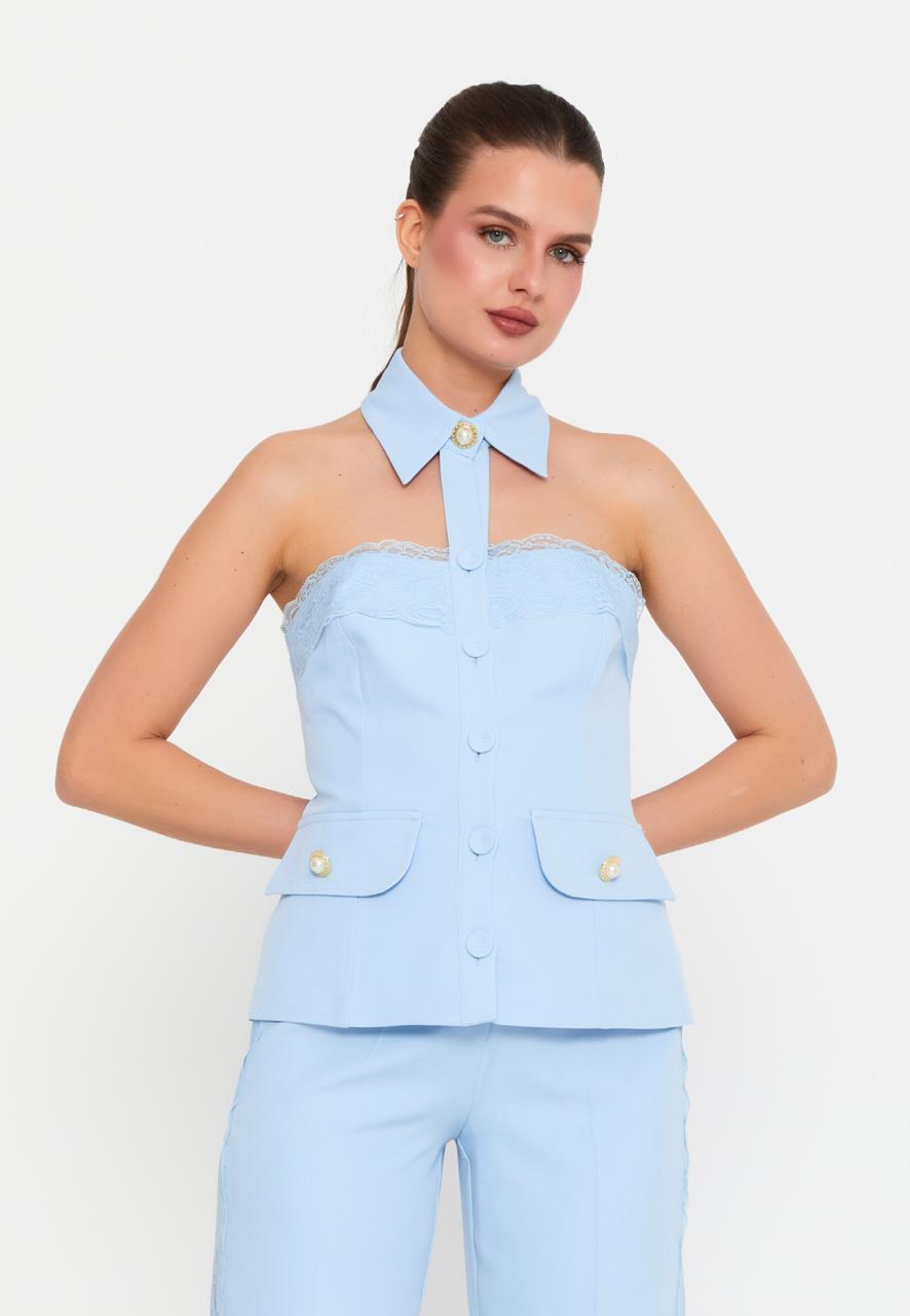 This pastel blue two-piece set features a strapless top with lace trim, gold-button pockets, and a detachable collar, paired with wide-leg pants accented by delicate side lace panels. A perfect mix of elegance and modern flair