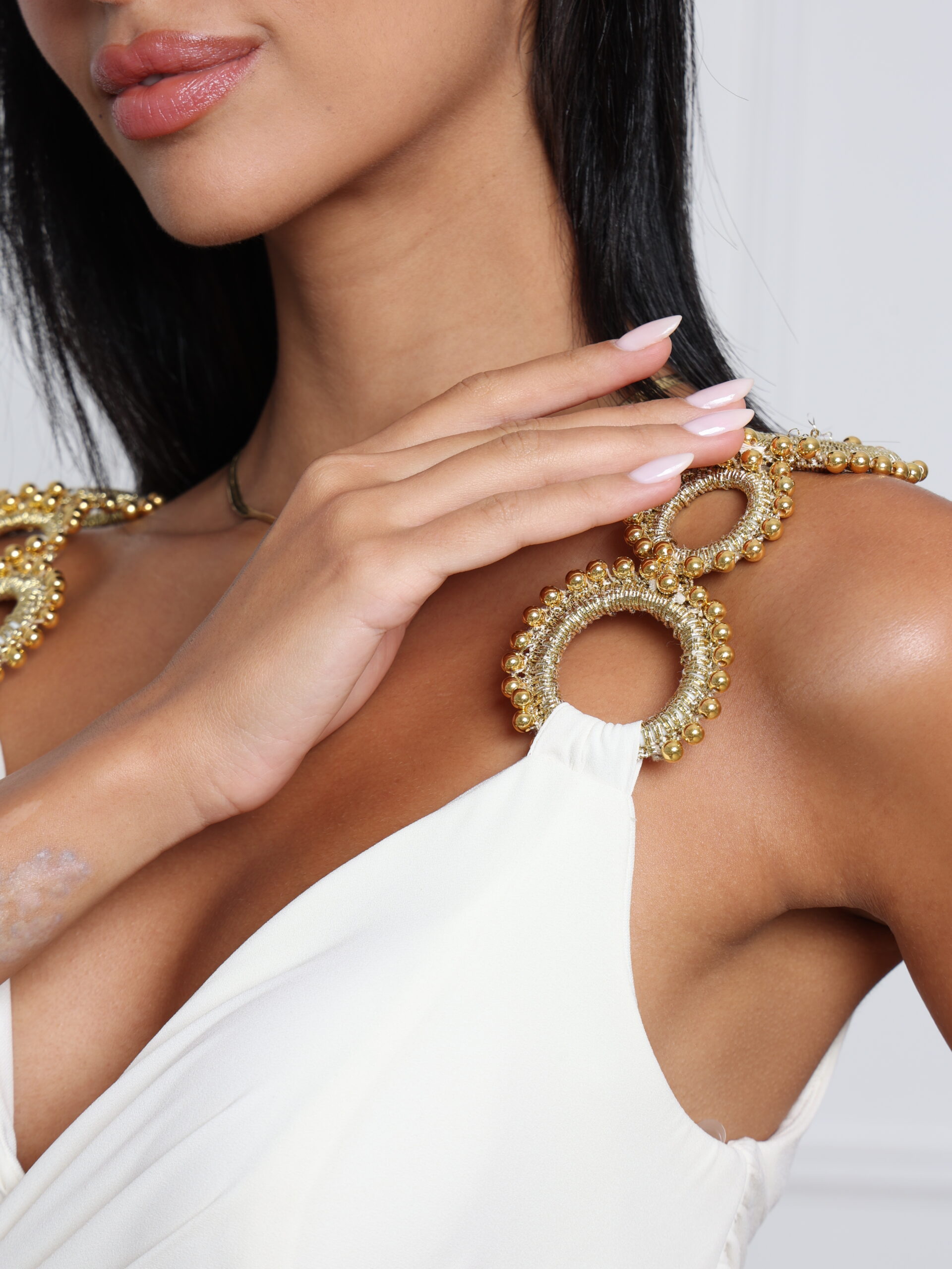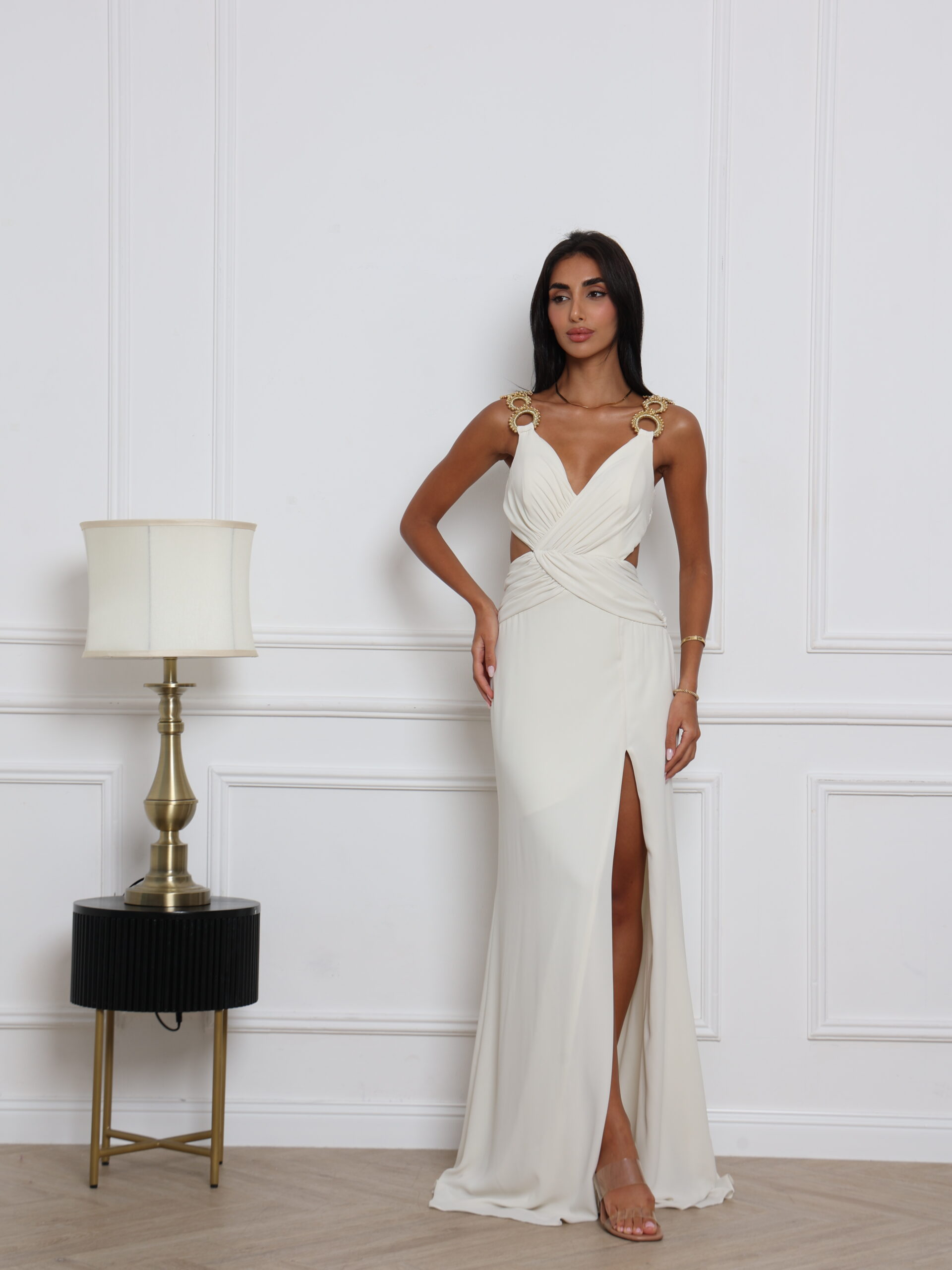 Chic and timeless, this white maxi dress features bold gold chain straps, flattering cut-out sides, and a front slit for a modern, sultry finish.